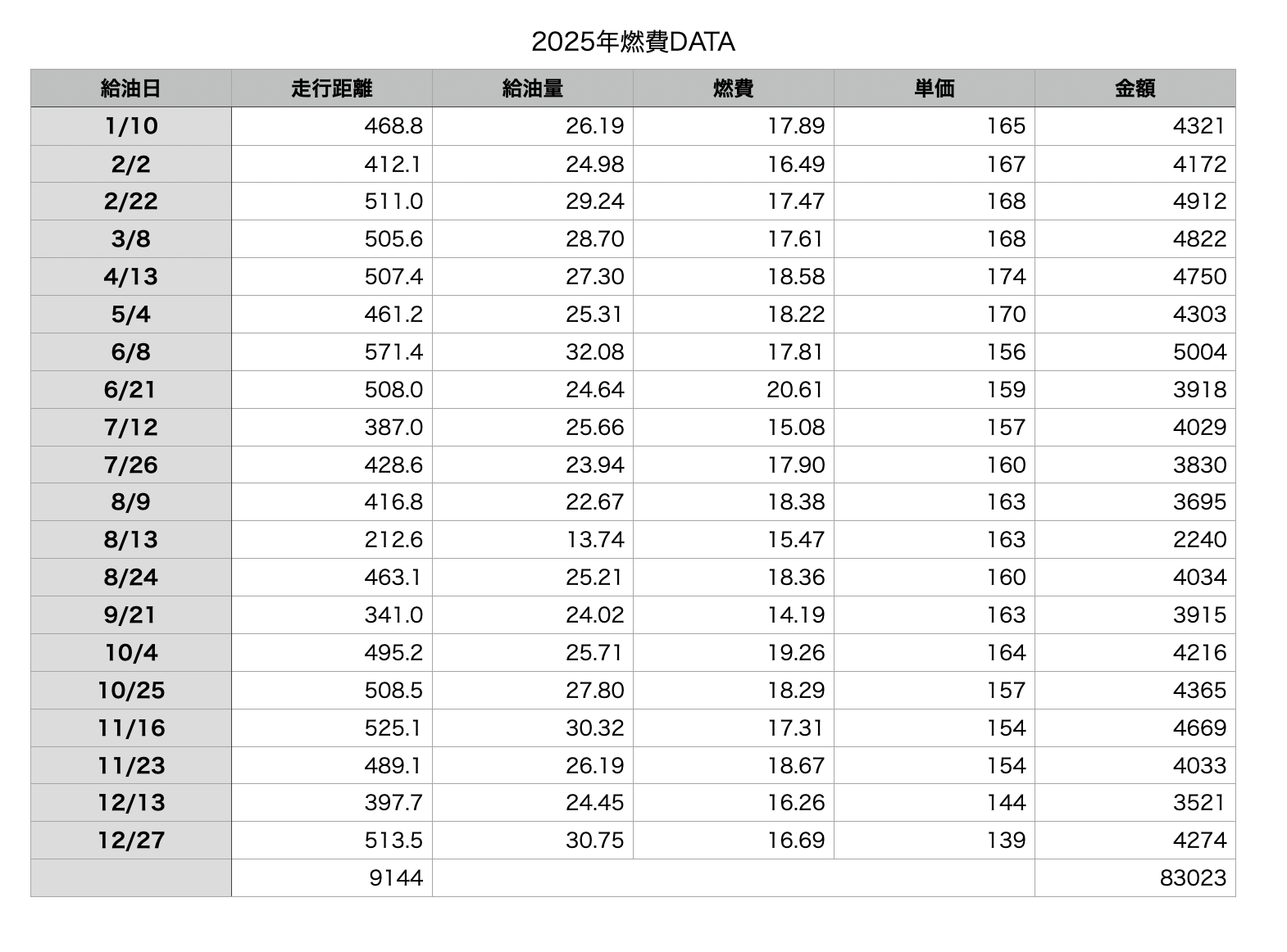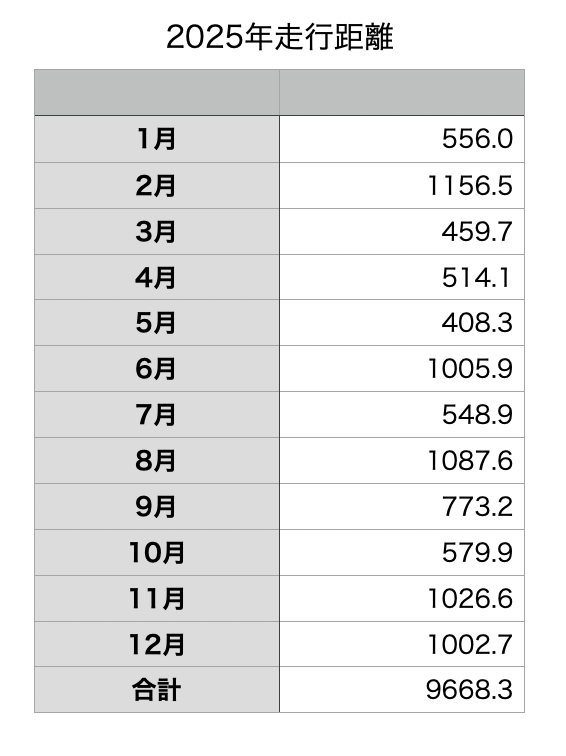 2025年走行距離&燃費DATA 車 X Facebook はてブ LINE コピー 2026.01.022025年の年間走行距離の報告です。 2025年は9668.3kmを走行。 2月に初めて月間1000km超えをし、月間1000km超えは5回、2024年よりも多く走行しました。月別の走行距離をまとめた表です。 2025年12月31日現在の走行距離です。 2026年中に7万キロの大台に達すると思います。月別の燃費DATAです。 給油回数は20回、合計83023円でした。