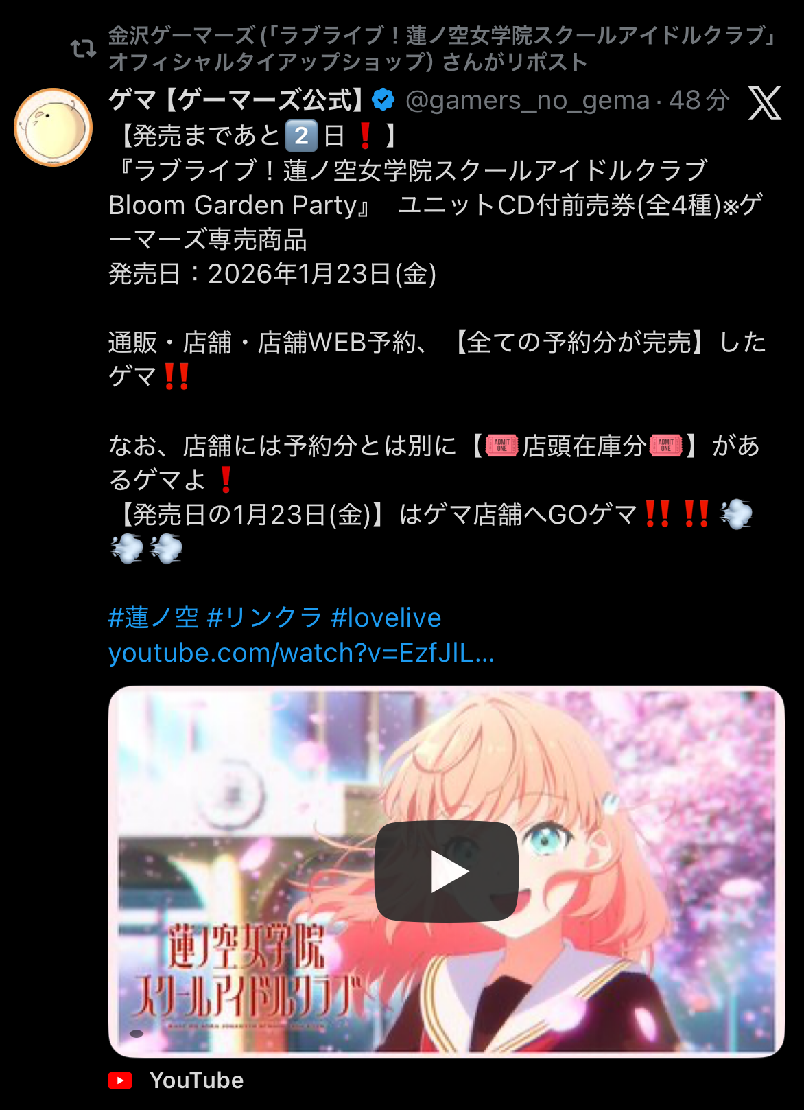 店頭販売開始当日の時点で、通販・店舗・店舗WEB予約の全ての予約分が完売した模様で、ゲーマーズ店舗での店頭在庫分のみとなっているようです。
